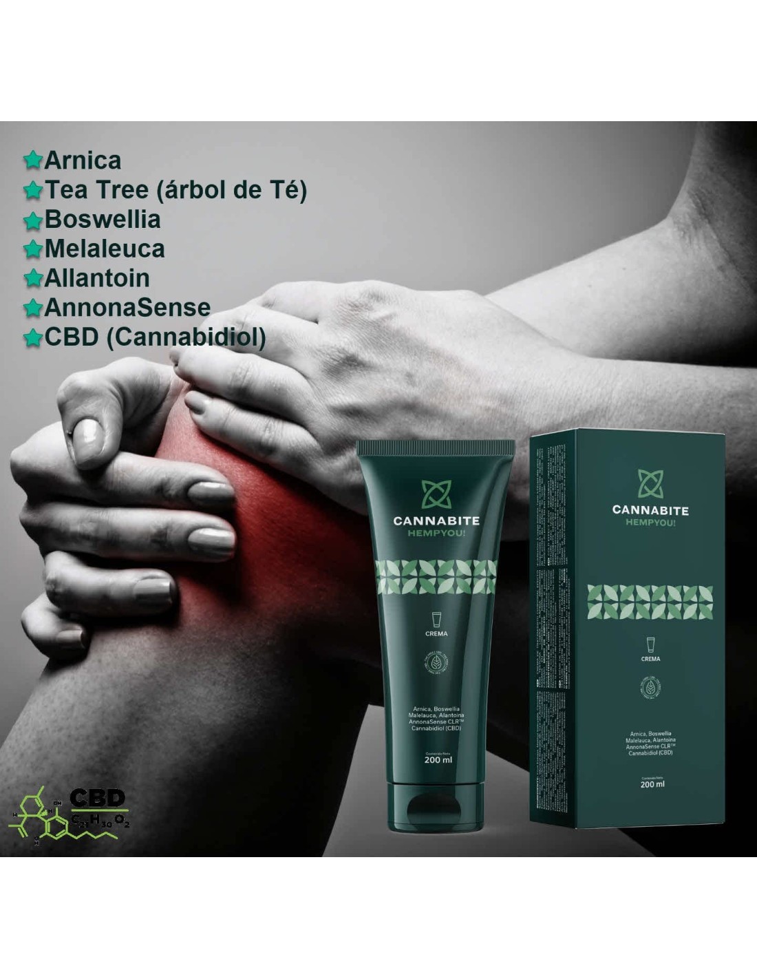 - Crema Masasje 200ml , CBD (Cannabidiol), Arnica, Boswellia , Alantoina , Aceite de Cáñamo, Arbol de Té y AnnonaSense.